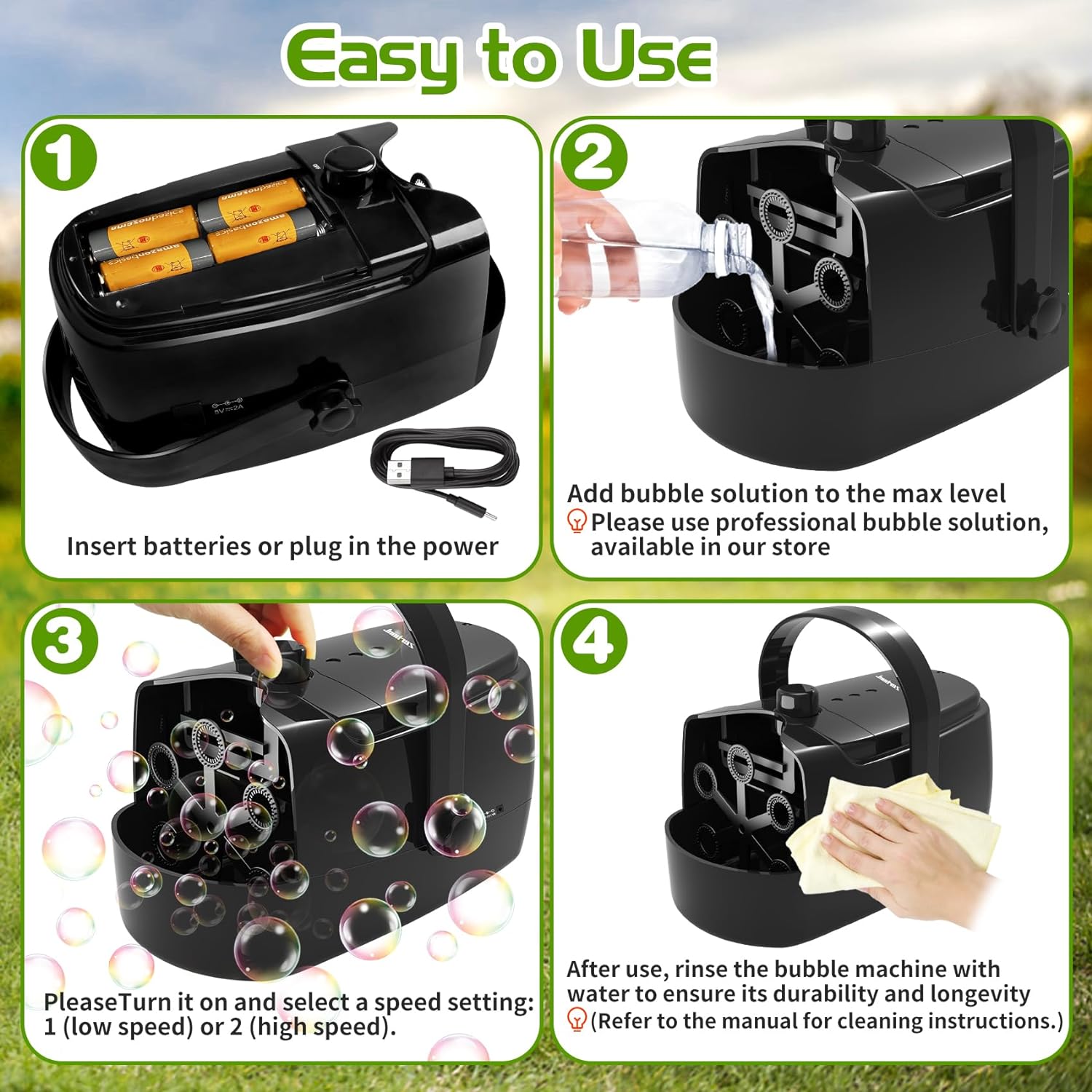 HAUT DÉBIT DE BULLES : Produit plus de 18 000 bulles éclatantes chaque minute grâce à 6 baguettes tournantes alimentées par un moteur intégré haute performance.