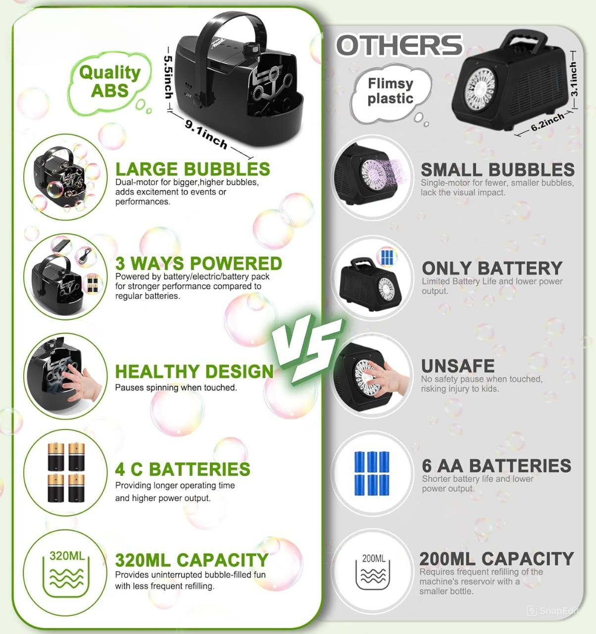 Avec une production impressionnante de plus de 18 000 bulles par minute, cette machine est fabriquée en ABS durable et résistant à la rouille, garantissant sa sécurité pour les utilisateurs de tous âges. Elle comprend une fonction d'arrêt automatique qui s'active au toucher, offrant une tranquillité d'esprit supplémentaire. Profitez de jusqu'à 30 minutes d'excitation ininterrompue de bulles grâce à sa grande capacité de 320 ml.