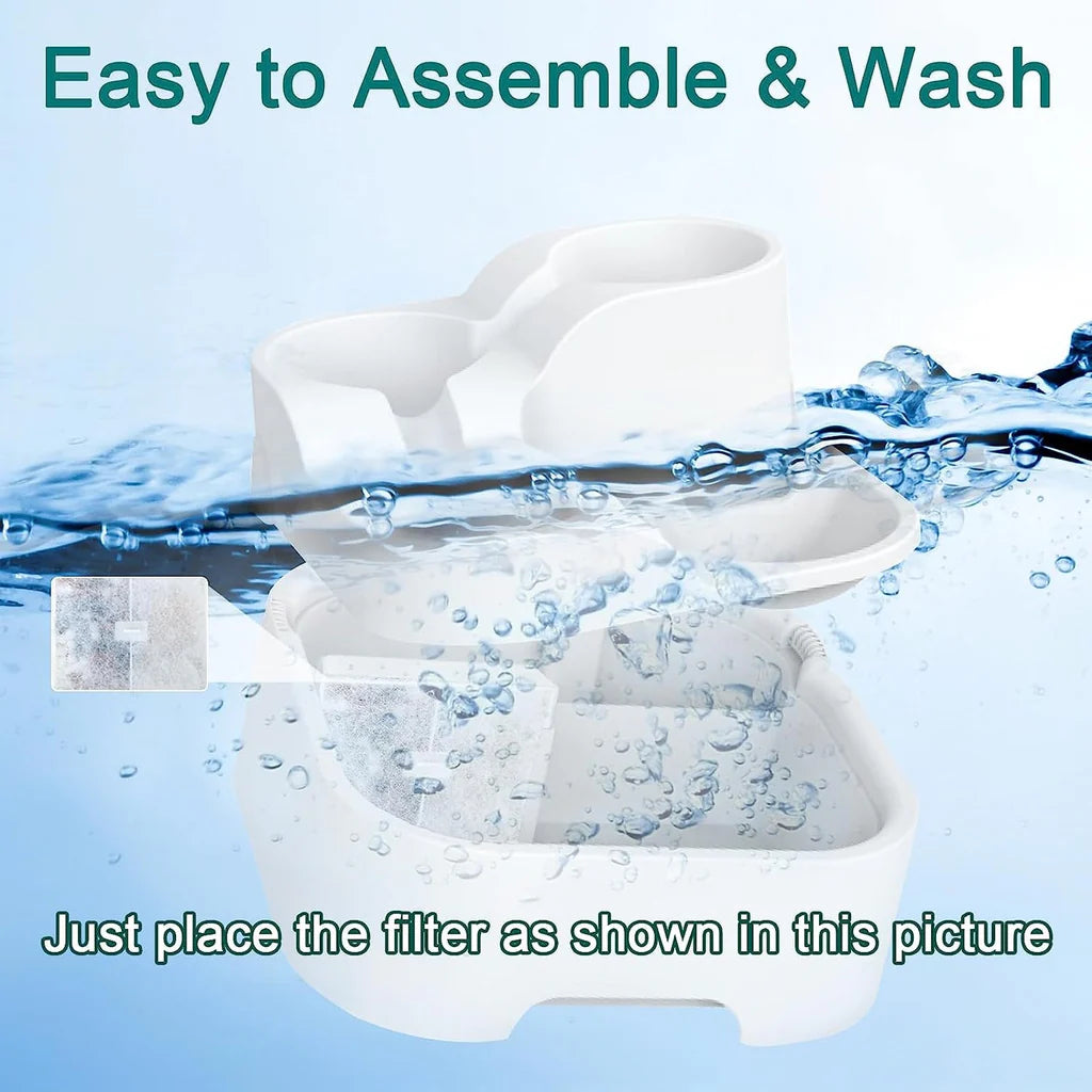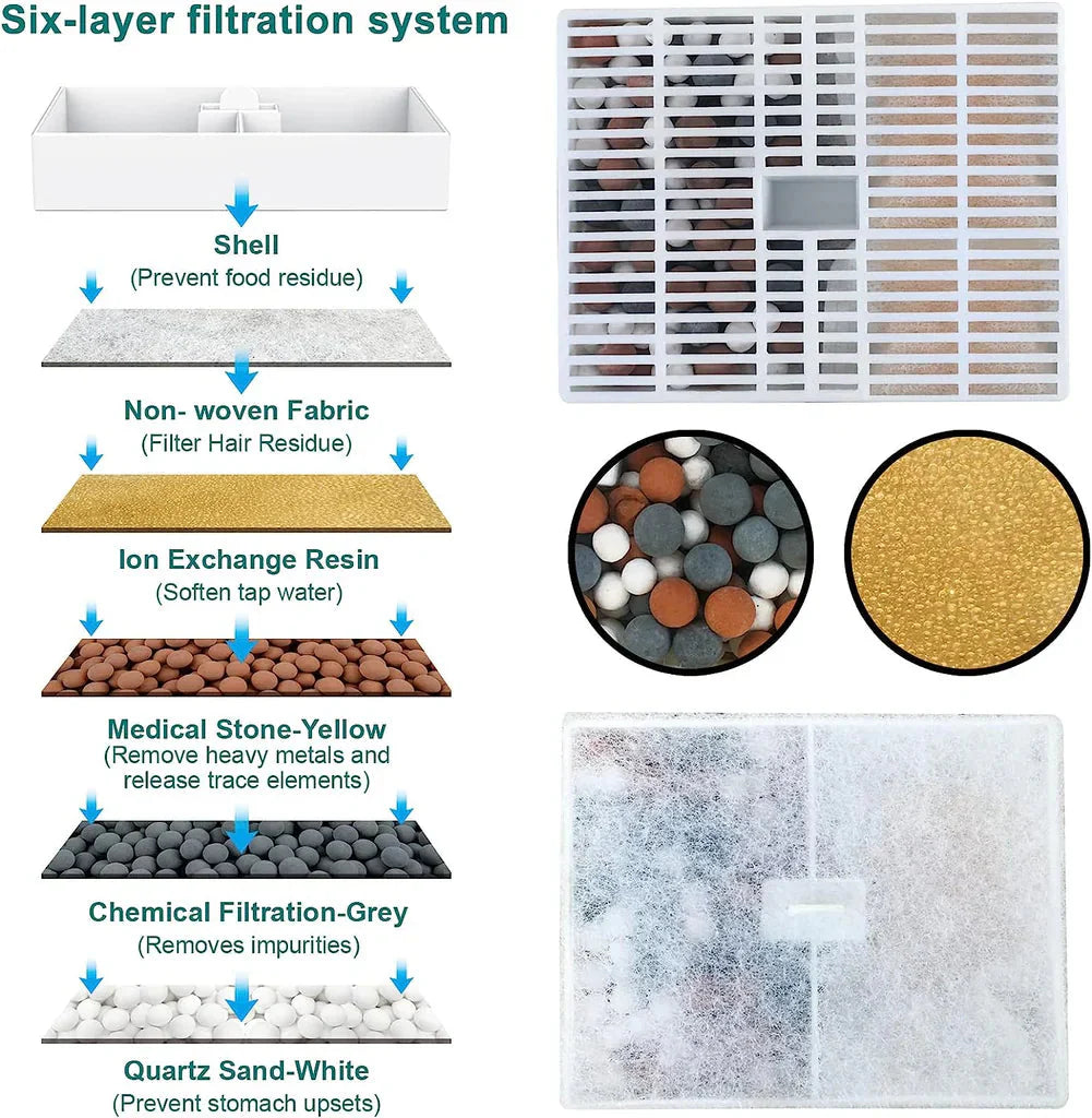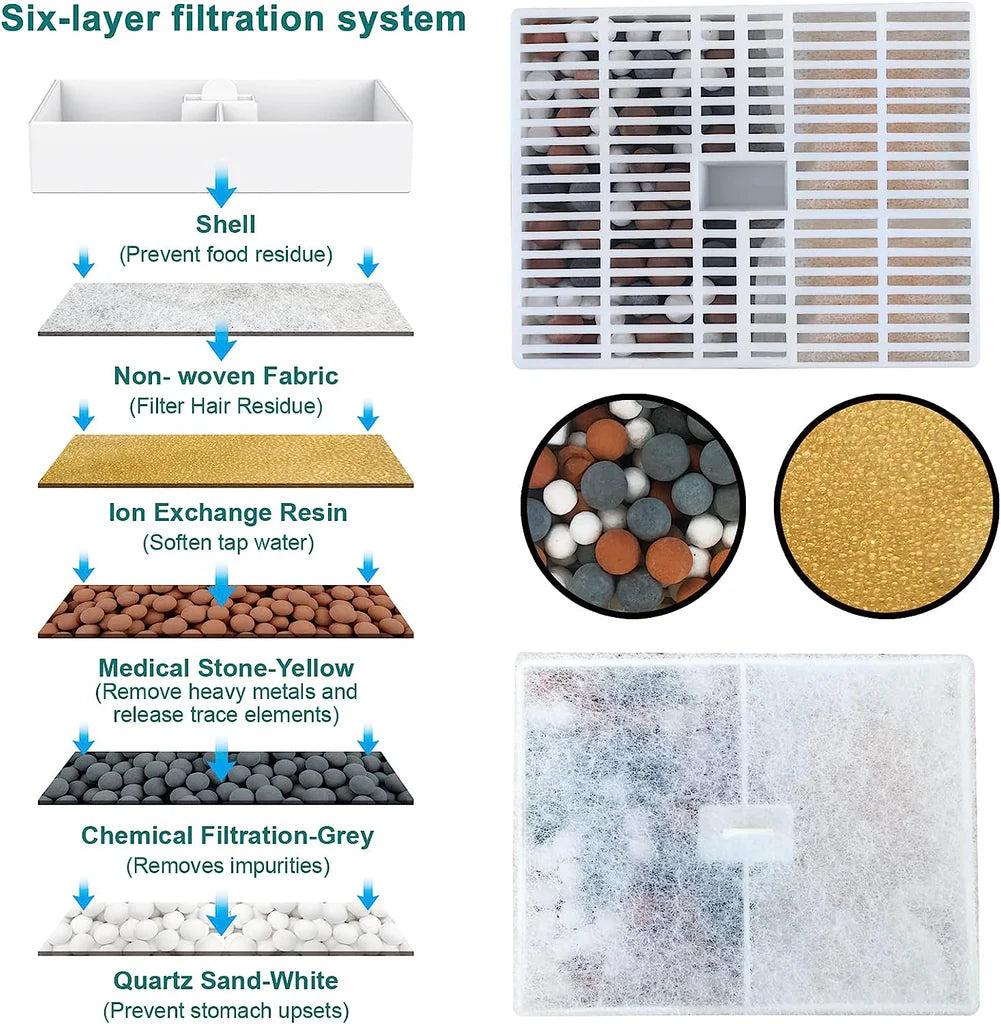 Notre fontaine est équipée d'un puissant système de filtration à six couches garantissant que votre animal bénéficie toujours d'une eau propre. Ce système optimise la qualité de l'eau, élimine efficacement les métaux lourds, supprime les impuretés, réduit les odeurs et améliore le goût. Pour votre commodité, trois packs de filtres sont inclus.