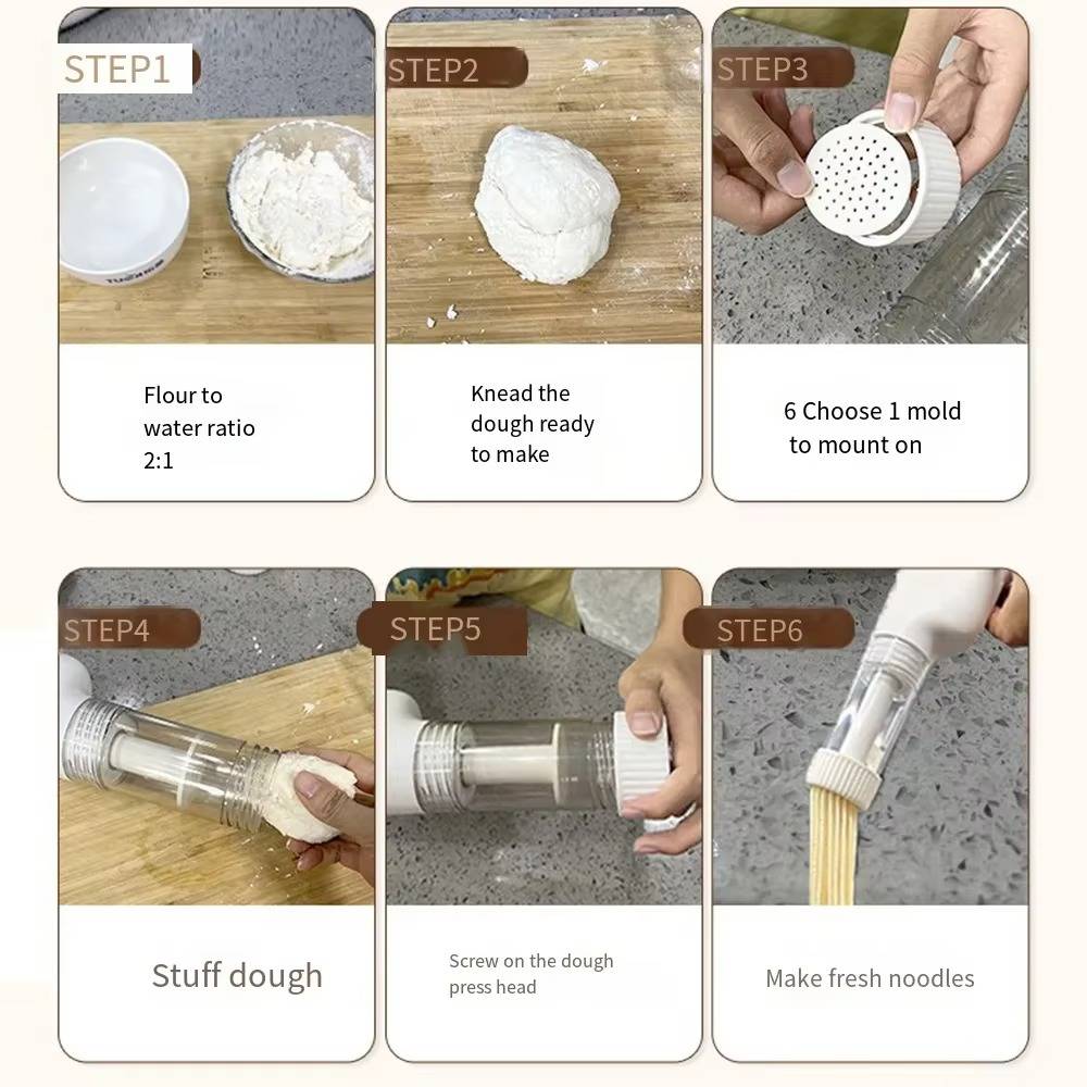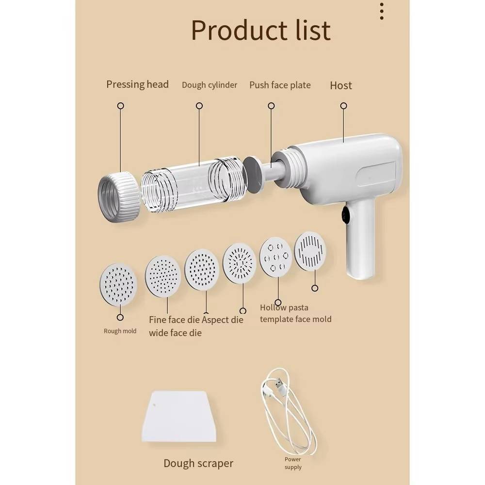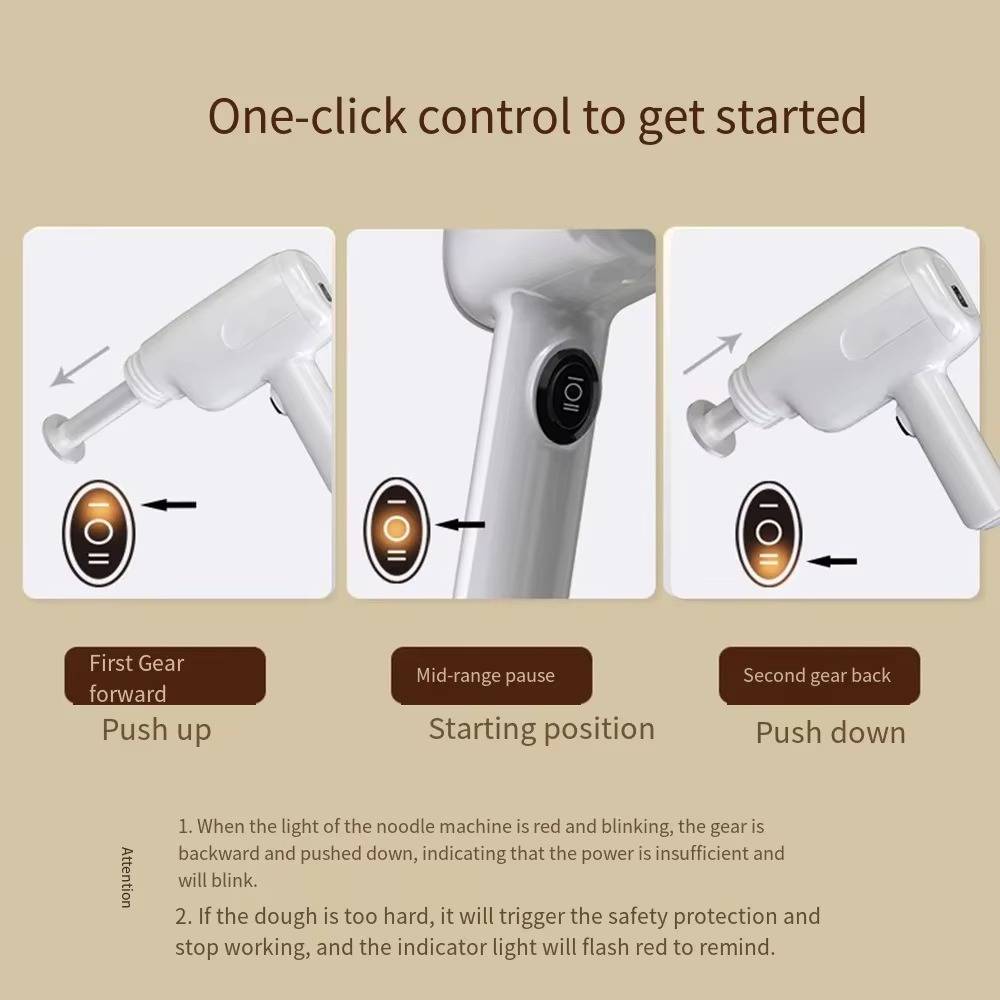 Cet appareil élégant produit 200 grammes de nouilles savoureuses à chaque cycle, alimenté par une batterie rechargeable robuste. Avec six moules professionnels disponibles, vous pouvez créer facilement une variété de formes de nouilles. De plus, le poussoir spécialement conçu assure un flux régulier et ininterrompu, garantissant des résultats impeccables à chaque fois.